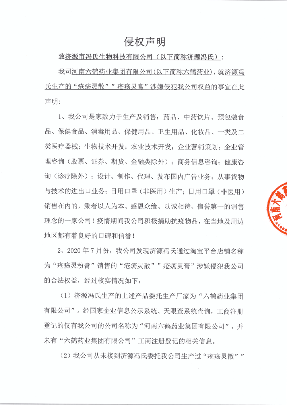 致济源市冯氏生物科技有限公司涉嫌侵权我公司合法权益声明